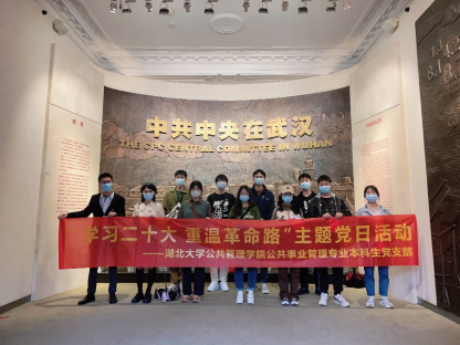 党的二十大报告中指出,弘扬以伟大建党精神为源头的中国共产党人精神谱系,用好红色资源。4月2日,公共事业管理专业本科生党支部赴武汉中共中央机关旧址纪念馆开展“学习二十大 重温革命路”主题党日活动。