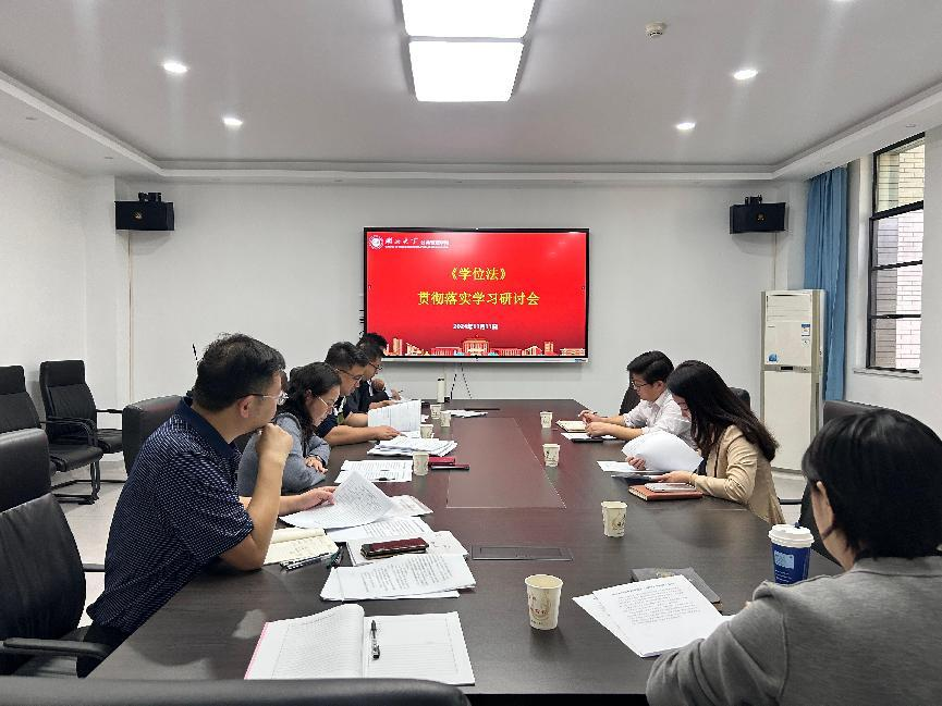 11月11日,402永利集团在523会议室组织学习《中华人民共和国学位法》,李荣娟经理、张小进副经理、周学荣教授、向良云副教授、王振伟副教授、谢迪副教授、谢丹副教授等学位委员会委员及研究生秘书张雷参加会议,会议由张小进副经理主持。