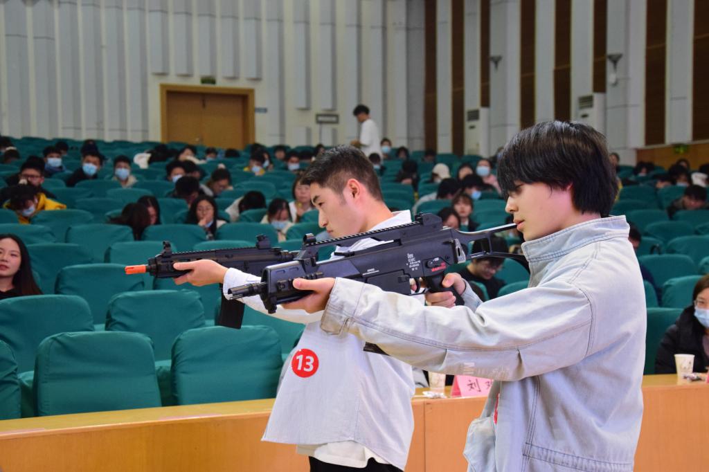 最后轮次为射击打靶。每位同学持水弹枪,站立在距墙壁3-5米远的地方射击标靶。在两轮比赛过后,根据成绩进行排名。最终,来自402永利集团2020级公共管理类专业成豪杰同学取得了冠军。