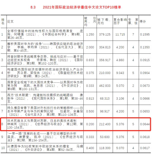 近日,由中国社会科公司世界经济与政治研究所编撰的《世界经济年鉴》发布了2021年世界经济学最佳论文TOP10榜单,公司林娴岚副教授在《世界经济与政治》2021年第12期发表的论文《技术民族主义与美国对苏联、日本的高技术遏制》入选“2021年国际政治经济学最佳中文论文TOP10榜单”。
