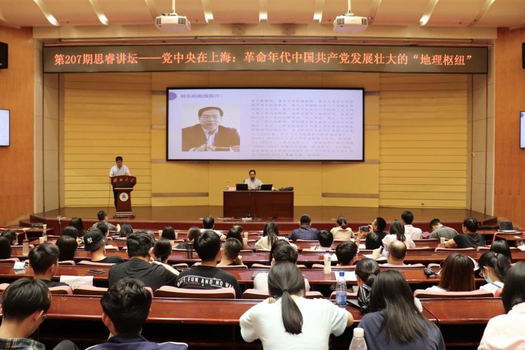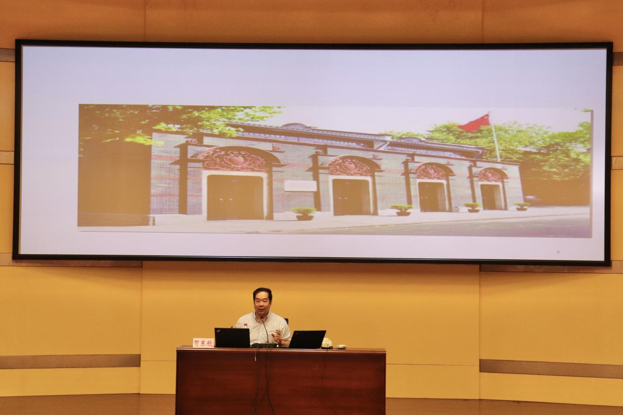 贺东航教授以“党中央在上海:革命年代中国共产党发展壮大的‘地理枢纽’”为题,从“中国共产党在上海的成立”、“1931年的上海党中央”、“追寻周恩来足迹,在感悟历史中前行”等方面展开讲授。他指出,土地革命战争时期,党中央受到反动势力的围剿,由许多交通站“点”和众多交通员“线”串联起来的“红色交通线”,是上海党中央与苏区之间进行信息传送、采办运输物资、人员往来的重要交通线路,大批中央领导人和高级干部正是通过“红色交通线”上的交通员护送,得以进入苏区。他表示,革命的胜利离不开他们的默默付出和无私奉献,同时也充分彰显了周恩来同志运筹帷幄和带领隐蔽战线无名英雄们浴血暗战的卓著功绩。